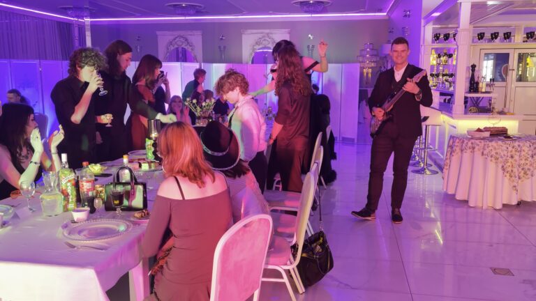 Podczas zabawy przygrywam w niektórych momentach na żywo na gitarze elektrycznej, zarówno przy stołach (popularne Miesiące) jak i w trakcie zabawy, między bawiącymi się na parkiecie, np. podczas bloku piosenek rockowych – oczywiście tylko jeśli sobie tego życzycie (podczas tworzenia agendy imprezy możecie to uwzględnić bądź wykluczyć).